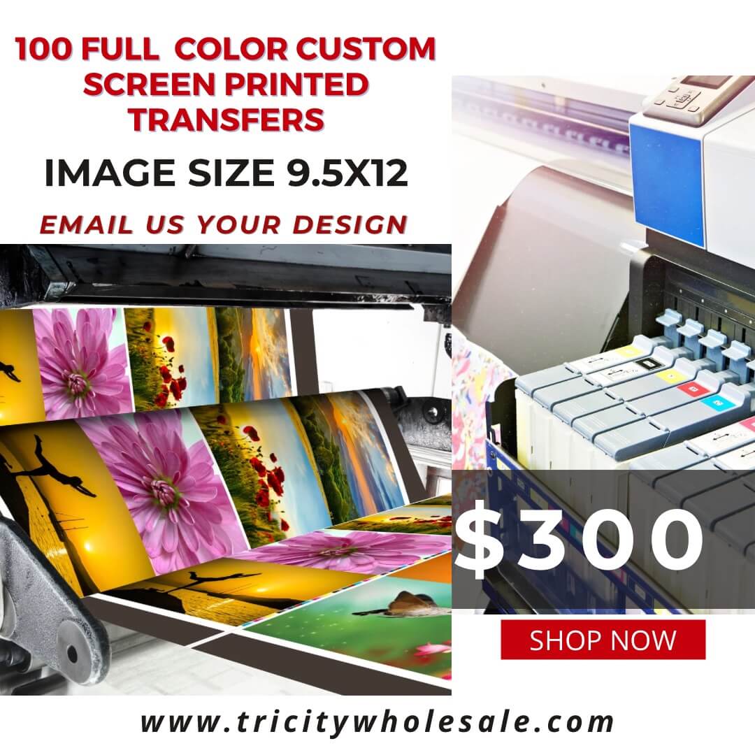 Transform your apparel into stunning works of art with our custom screen printed transfers. These can be applied to all cotton and polyester fabrics. Elevate your brand, team, or event with vibrant designs that captivate. This deal is for full color designs without limits, with an image size of 9.5X12 inches. Screen print transfers help save time and effort due to its easy application and production time, allowing for faster order fulfillment and delivery to your customers. These transfers are designed to withstand repeated washing and wear, ensuring your designs stay vibrant and intact maintaining the quality of your merchandise. After purchase you must email design, name, and order number to tricitywholesale706@gmail.com!